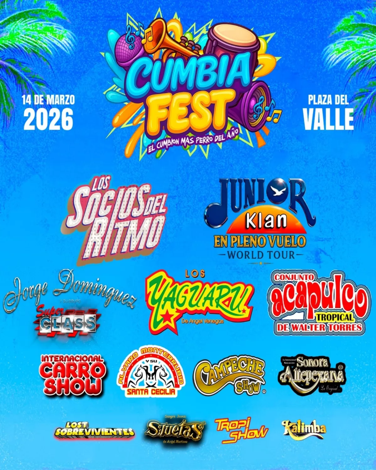 El Cumbia Fest destaca por presentar un cartel de primer nivel encabezado por Junior Klan con su gira “En Pleno Vuelo World Tour”, una de las agrupaciones más queridas del género tropical. A ellos se suman leyendas y consentidos del público como Los Socios del Ritmo, Los Yaguarú de Ángel Venegas, Conjunto Acapulco Tropical de Walter Torres y Jorge Domínguez y su Grupo Super Class, garantizando un recorrido musical lleno de clásicos y nuevos éxitos.