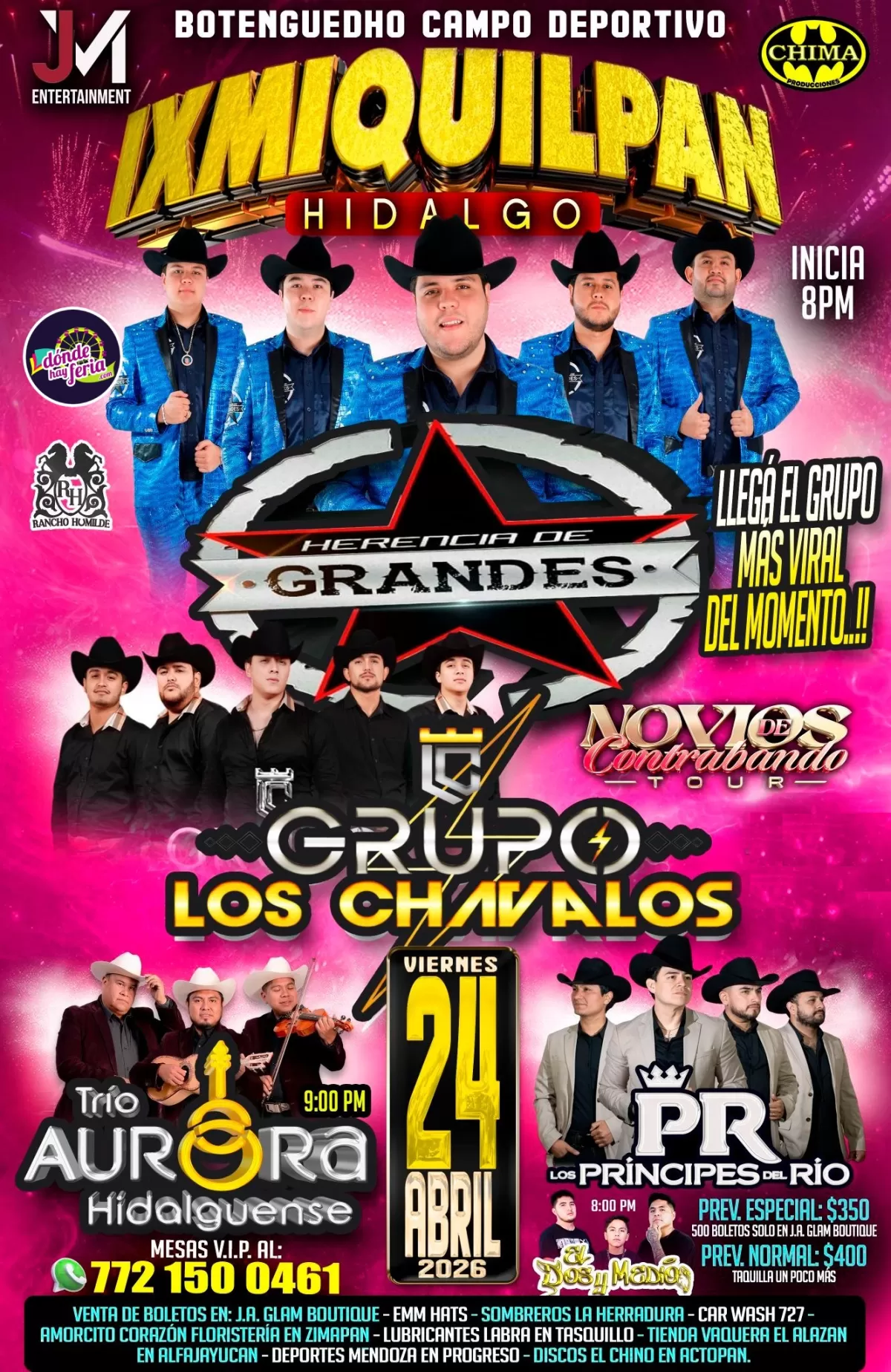 Si eres amante de los bailes, la música en vivo y las grandes producciones, este 24 de abril de 2026 tienes una cita imperdible en Ixmiquilpan, Hidalgo. Prepárate para cantar, bailar y vivir una noche histórica con Herencia de Grandes, Grupo Los Chavalos y grandes invitados.