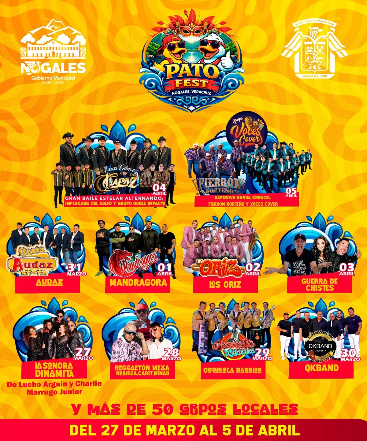Finalmente, el 5 de abril cerrará el festival con la participación de Explosiva Banda Krrucel, Fierron Norteño y Voces Cover, ofreciendo un gran cierre lleno de música y energía. Con esta cartelera, el Pato Fest Nogales 2026 promete ser una de las celebraciones más completas y atractivas de la región, combinando diversión, música y tradición en Nogales, Veracruz.